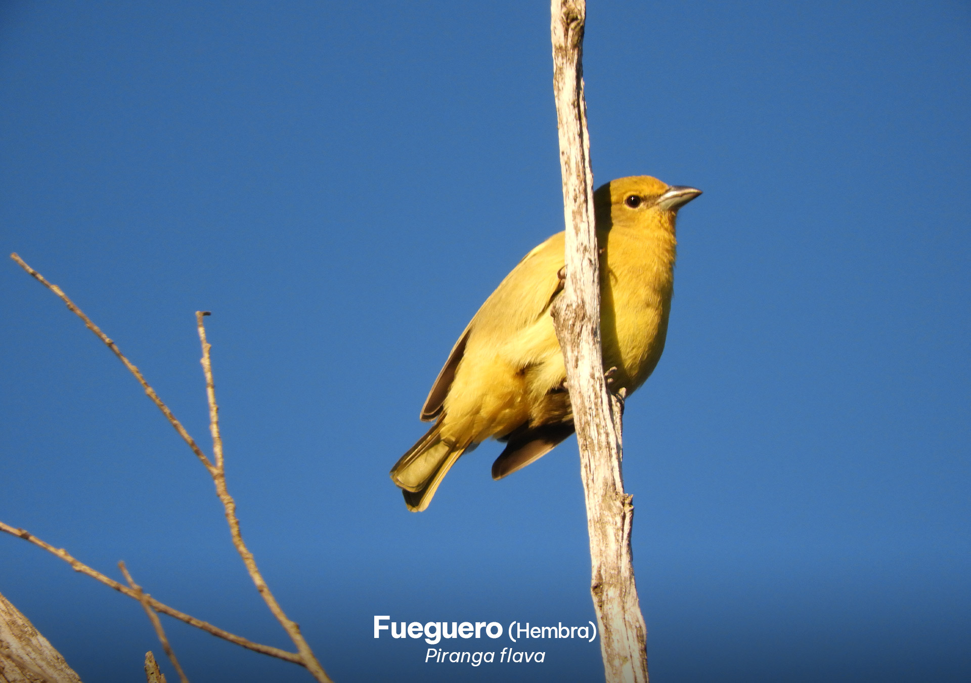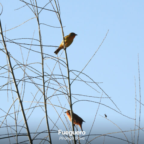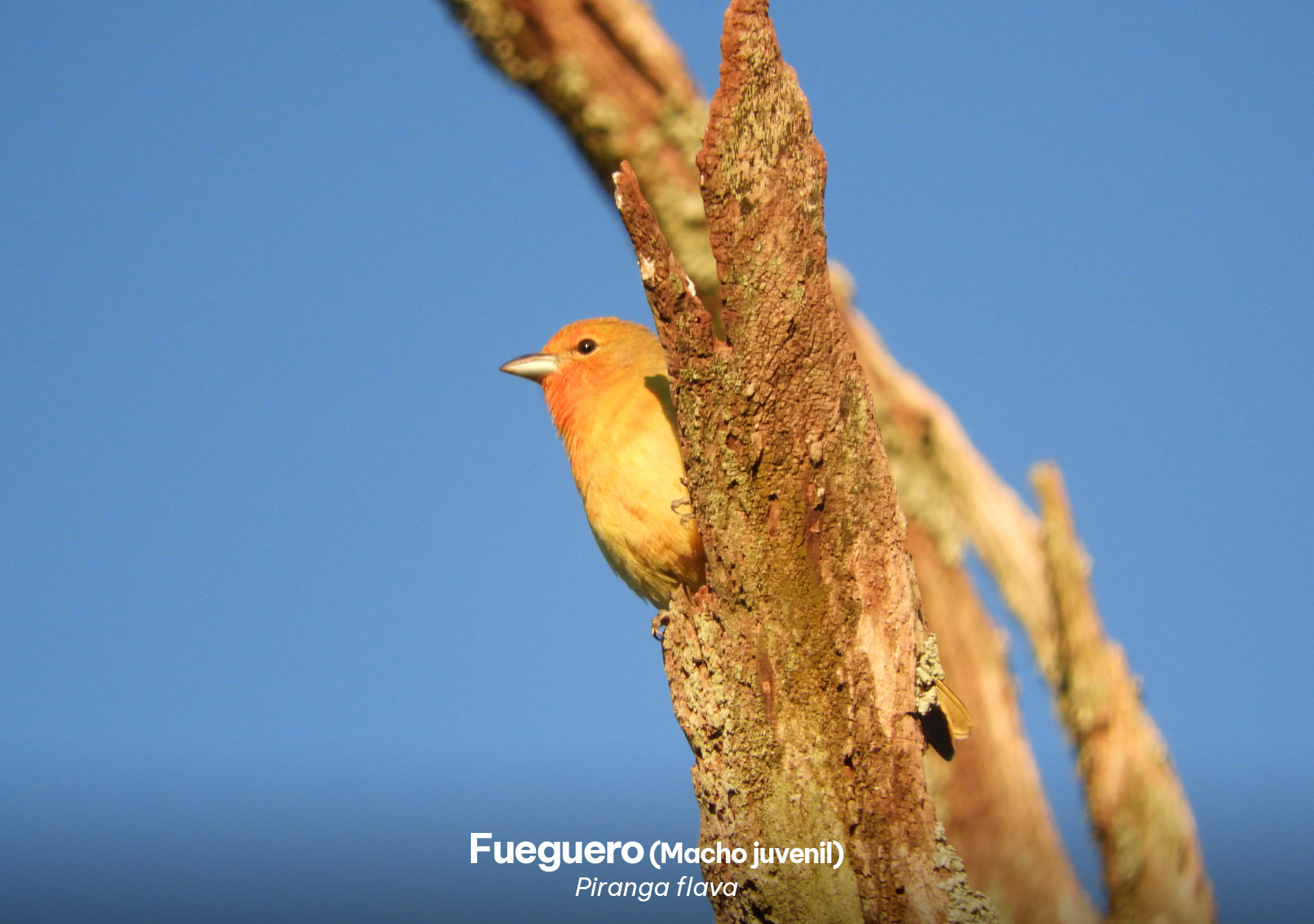 Miden entre 17 y 19 cm de longitud. El macho es de plumaje rojo anaranjado y rojizo más intenso en la parte ventral. La hembra de dorso amarillo oliváceo y vientre de color amarillo. Tiene Alas y cola pardusca, distinguiéndose por su pico negro y un color más intenso. Posee un parche más oscuro en la región auricular.